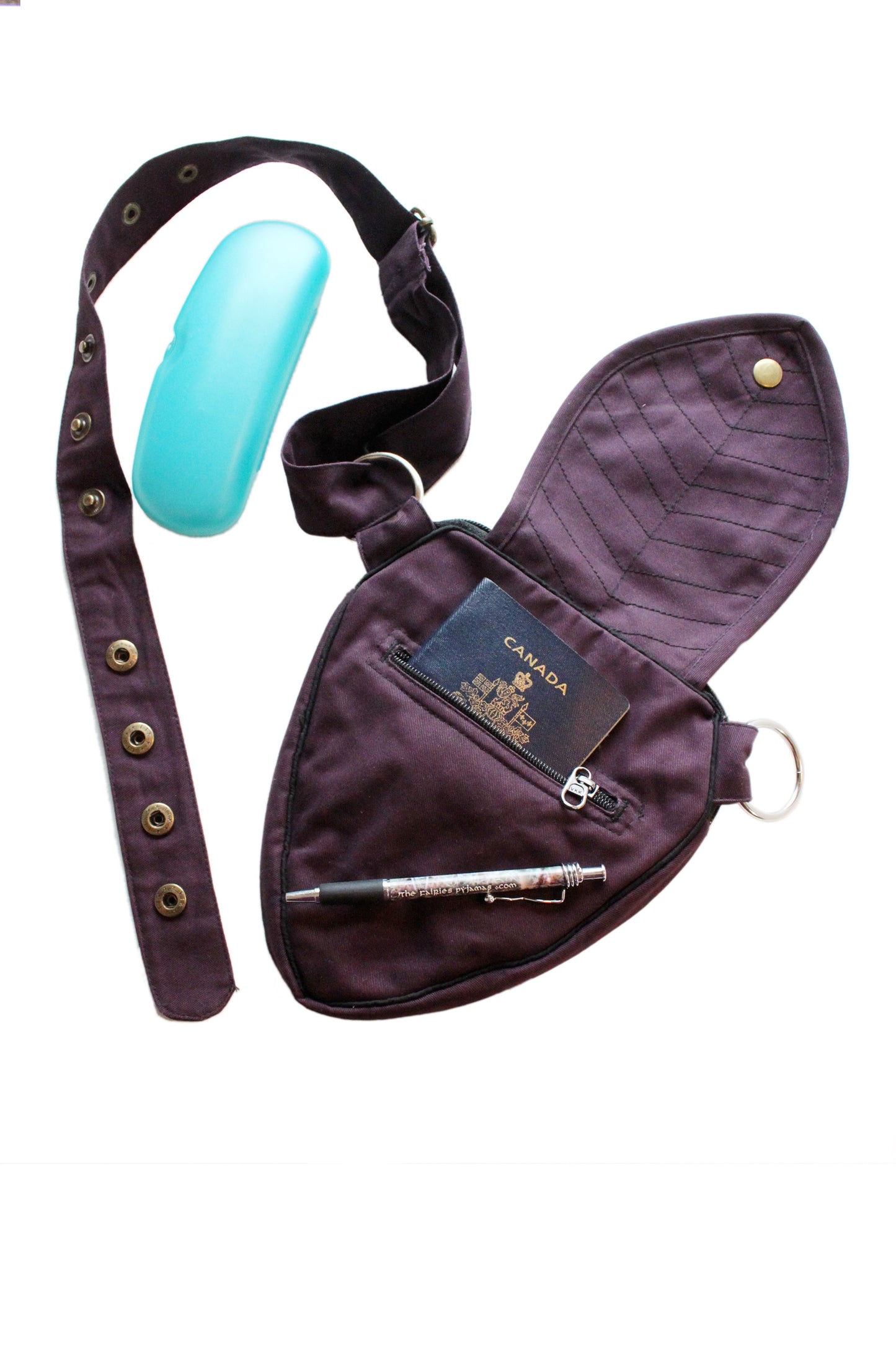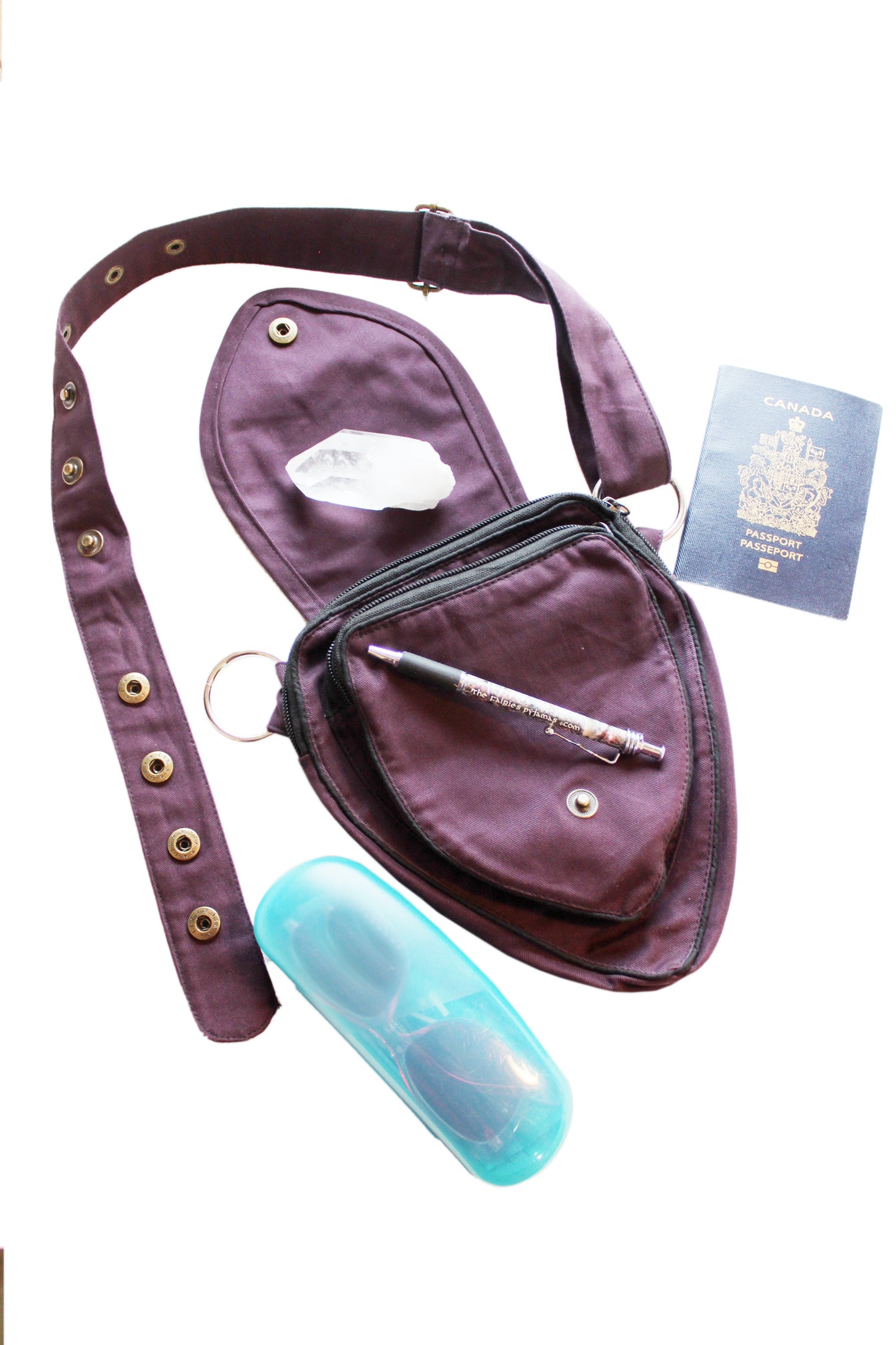 Adornments on this item include antiqued brass hardware such as snaps, rings, and belt adjusters. The rings are perfect for securing a carabiner for those times you just don’t have a free hand to hold your keys or water bottle. By loosening the belt adjuster our hip-pouch becomes a small satchel-style bag to be worn over the shoulder or across the chest as desired.