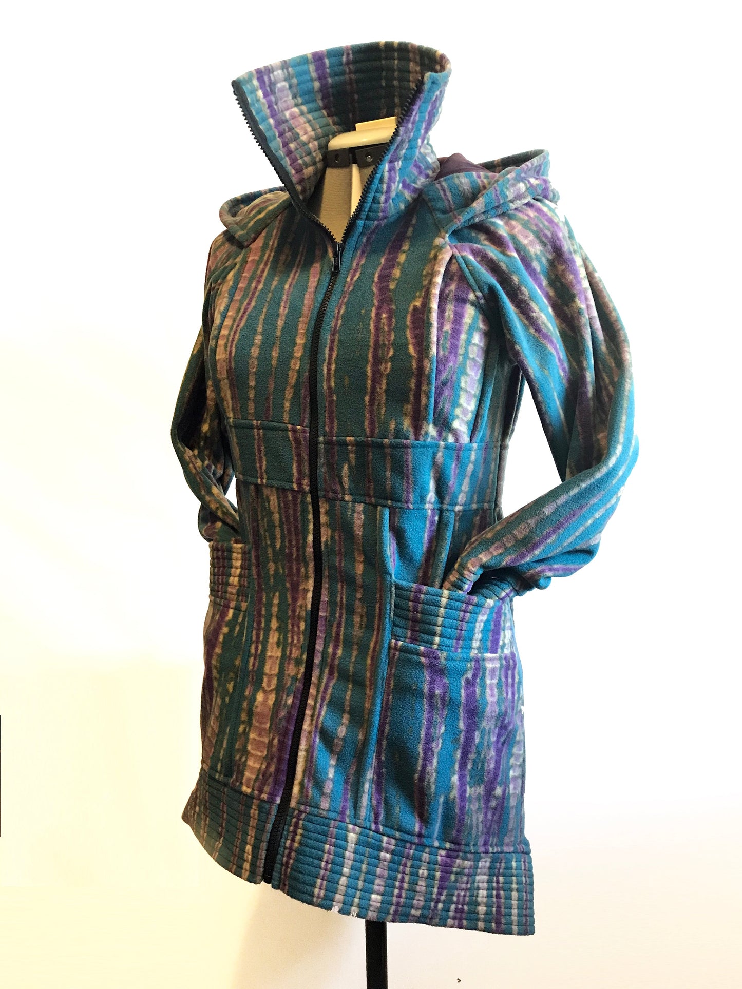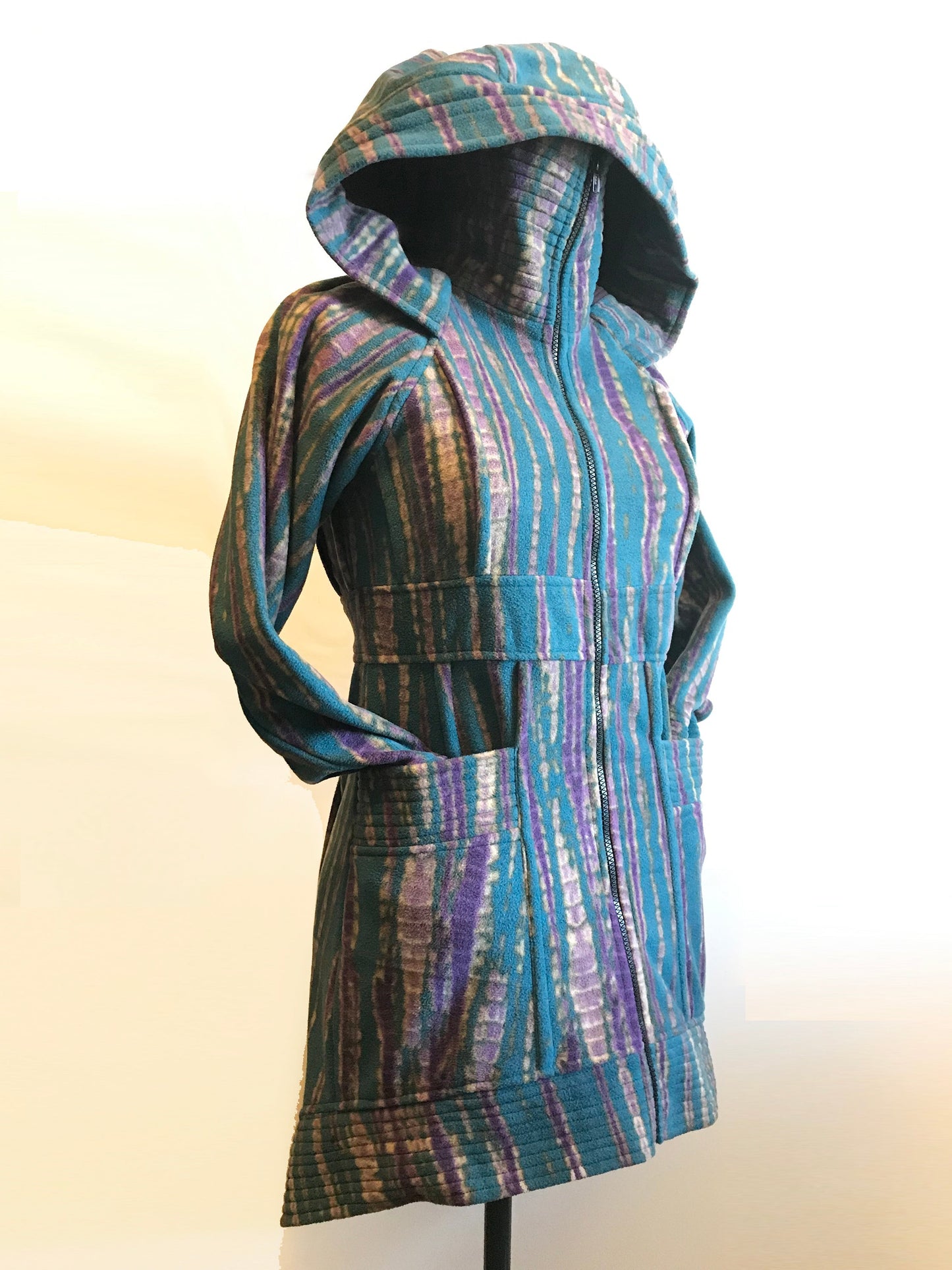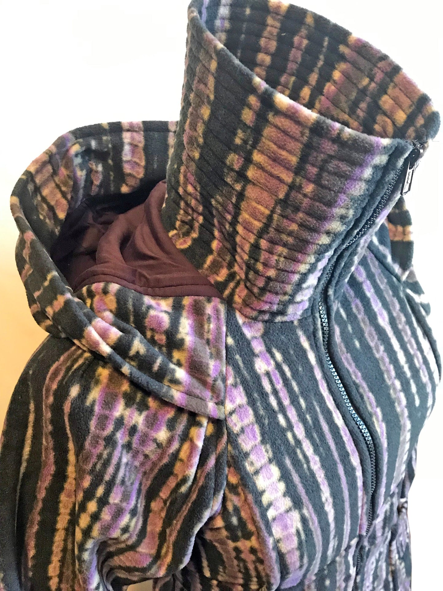Adorable while being functional and comfortable. The super soft Fairies Fleecey will keep you warm, prepared, and can be worn under your parka too. In a flattering hourglass shape along with vertical Tie Dyed stripes, this hoody is slimming while serving your fairy needs for generous pockets and a lined hood.