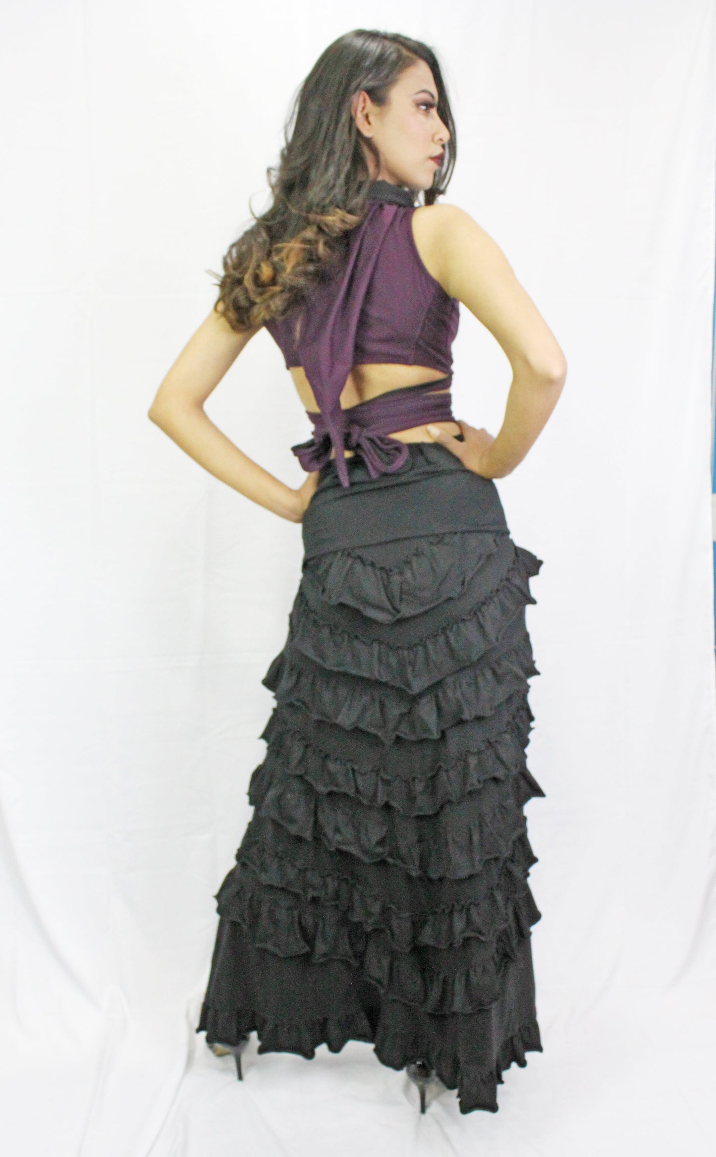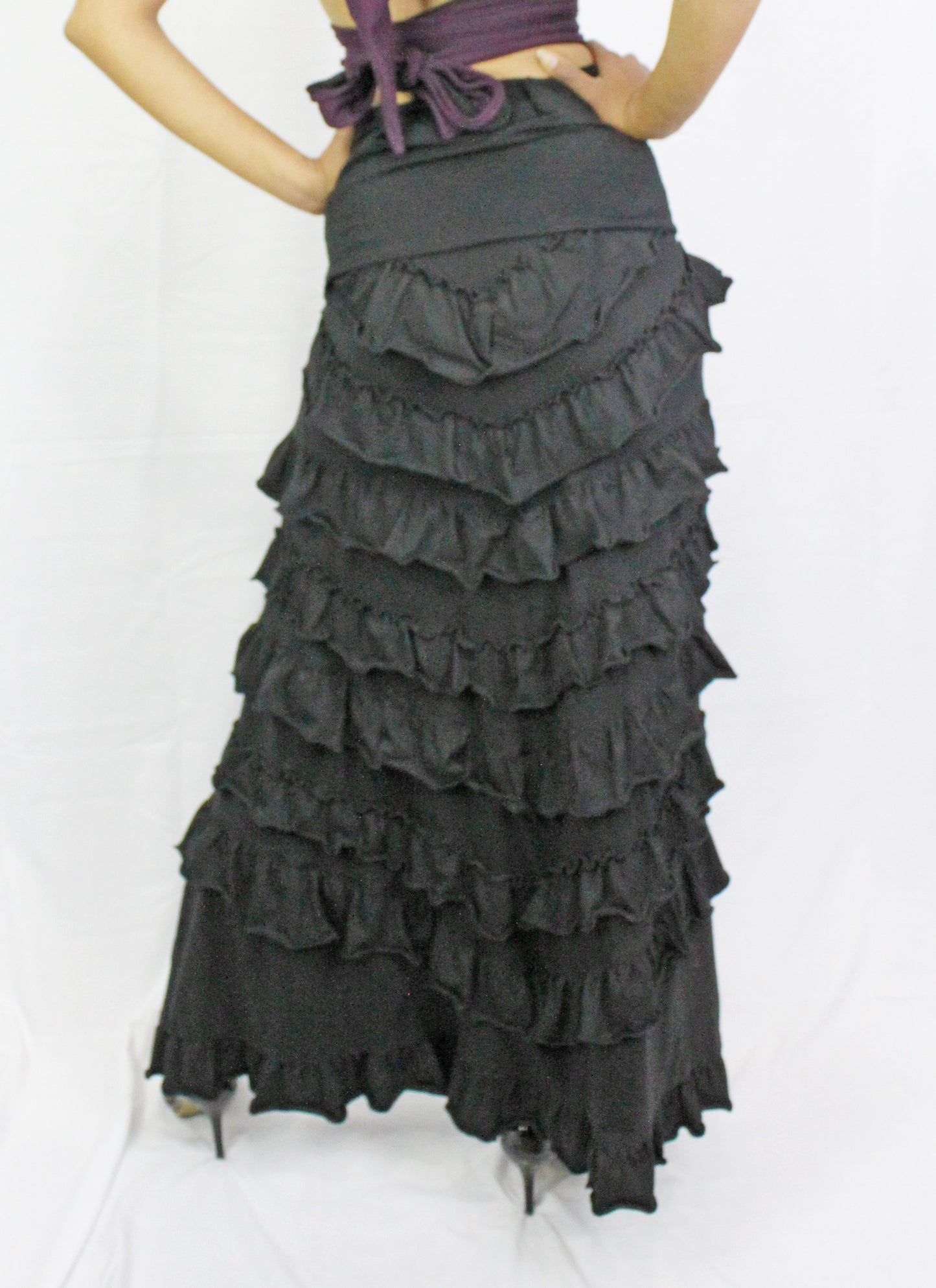 Elevate your outfit and show off your legs in the Fairy Ren-Faire Skirt. Inspired by burlesque, sexy bohemian and renaissance fairs ; this full length skirt adds a cosplay flair to any outfit. With functional adjustable ties to change the length, a fold over waist band to flatten the tummy and layered ruffles on the back for a bustle like effect, lead with your legs to your next event.