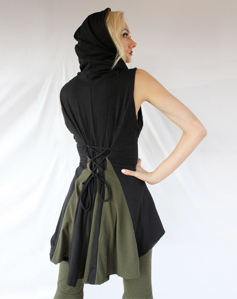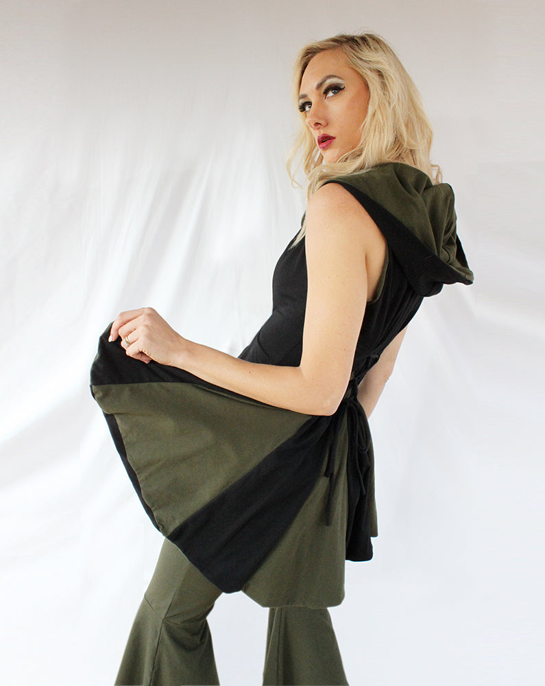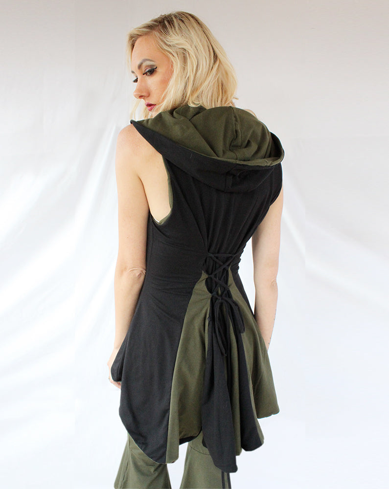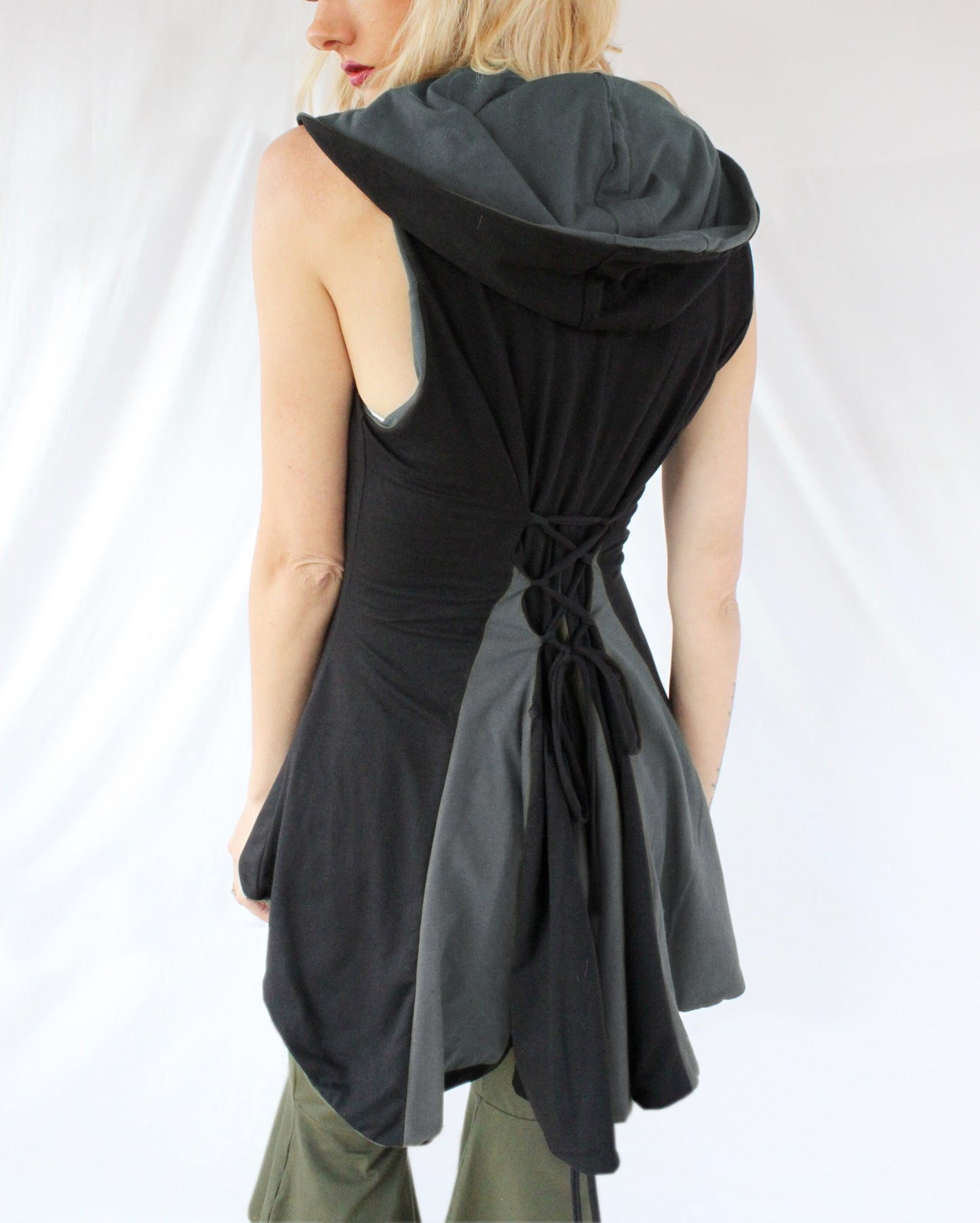 Unleash your inner acrobat! Here we’ve managed to unite the mystery of a roomy hood, the fit of a zip-up vest, and the lacy sexiness of a corset all in one comfortable, versatile, and most of all, REVERSIBLE, design!